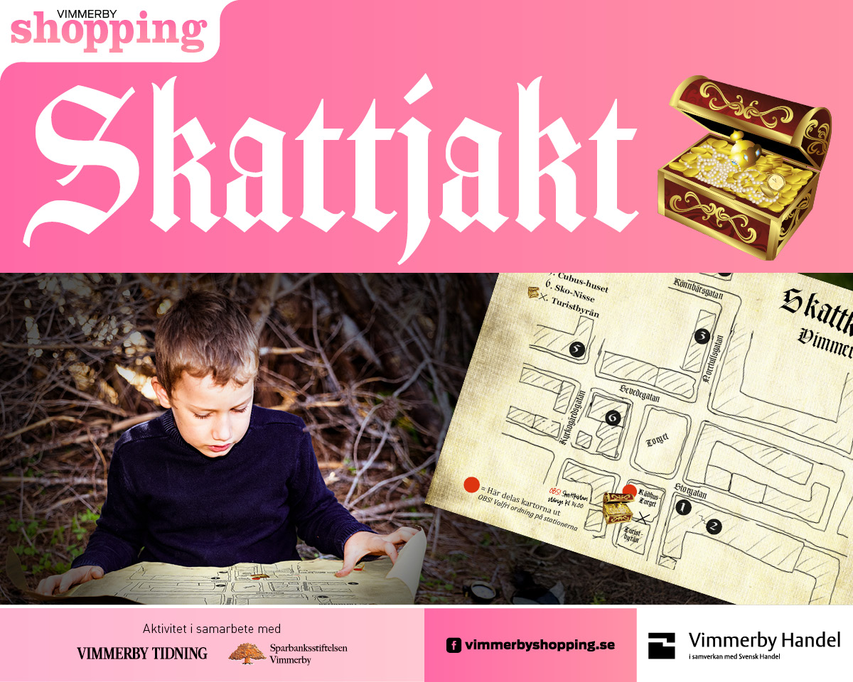 Gratis Skattjakt i Vimmerby med start på torget kl 10.30 till 13.00. Du får en karta där du ska gå runt och lösa uppgifter i några av stadens butiker. En svårighetsgrad för barn ca 3-6 år och en för barn ca 7-12 år. De små samlar piratpengar och de stora samlar bokstäver. När ni löst alla gåtor så lämnar ni era piratpengar/bokstäver till piraterna på torget så får ni ett Diplom och får sedan träffa Pirat Vitskägg som säkert låter er få ta del av skatten som brukar vara något riktigt smarrigt. Välkomna!